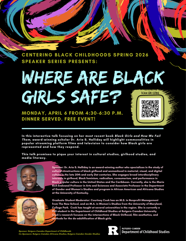 In this interactive talk focusing on her most recent book Black Girls and How We Fail Them, award-winning scholar Dr. Aria S. Halliday, in conversation with Rutgers Camden Department of Childhood Studies graduate student Courtney Cook, will highlight commonalities in popular streaming platform films and television to consider how Black girls are represented and how they respond. This talk promises to pique your interest in cultural studies, girlhood studies, and media literacy.